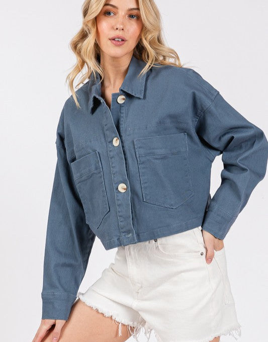 The Button Down Cropped Denim Jacket with Patch Pockets is a trendy and versatile outerwear piece that combines classic style with modern details. This jacket features a button-down front for a timeless look, while the cropped silhouette adds a contemporary touch. The patch pockets add a functional and stylish element to the jacket, providing extra storage space and visual interest. Perfect for layering over a variety of outfits, this denim jacket is a must-have staple for your wardrobe. Stay on-trend and effortlessly cool with this chic and stylish cropped denim jacket.