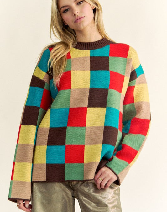 Checkered Color Block Sweater Davi & Dani Dropped Shoulder Long Sleeve