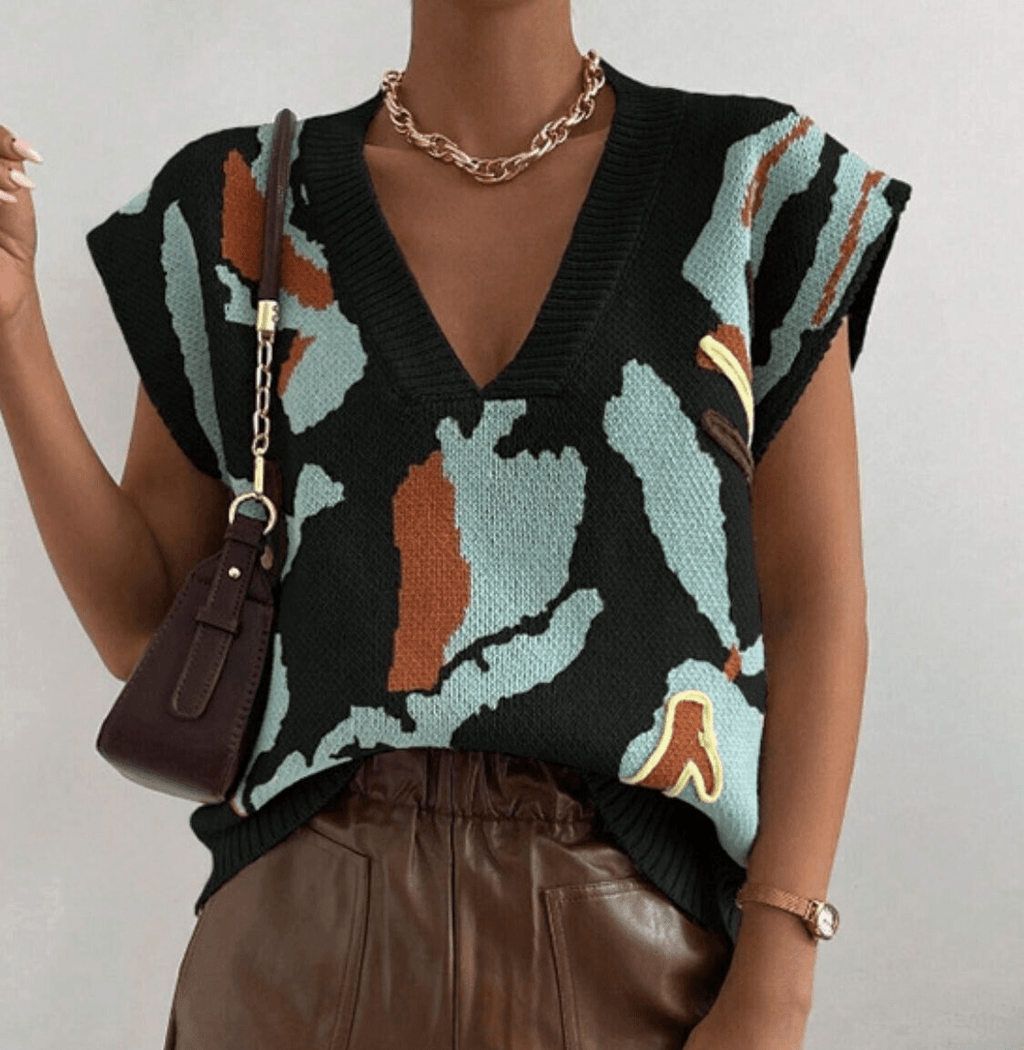 Add a pop of color to your wardrobe with this fashionable sweater vest by R.Y. The tight-knit polyester fabric features a vibrant paisley pattern and a V-neckline that adds a touch of elegance to your outfit. The sleeveless design with cold shoulder sleeves is perfect for layering and the oversized fit provides a comfortable and stretchy wear. Ideal for travel, casual outings, workwear, and business, this knitwear top is machine washable and easy to maintain. The colorful and fashionable theme makes it a must-have for the winter and fall seasons. This sweater vest is available in regular size and fits true to size.